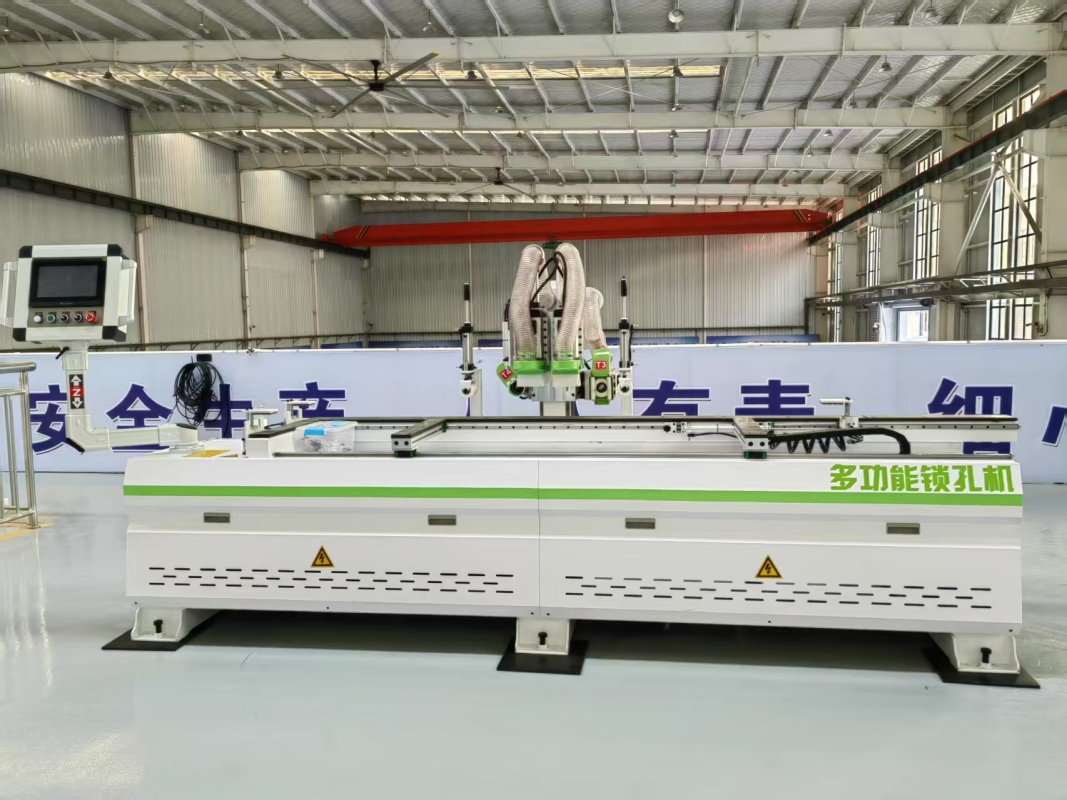 El control de programación CNC se combina con una estructura mecánica de enlace multieje para lograr un procesamiento totalmente automático, de alta precisión y en una sola operación de los orificios para cerraduras de puertas de madera, orificios para bisagras y ranuras de procesamiento.